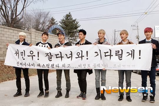 In the official photos, Minwoo is trying to comfort Sanghoon, who must be feeling the loneliest among the members, before entering Uijeongbu training camp. Minwoo is going to be released on December 3, 2015.
