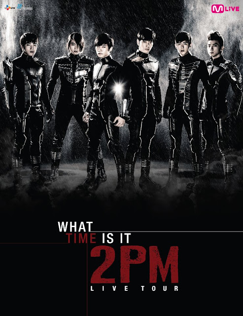 On November 12, JYP Entertainment released the group poster for the ‘2PM Tour 2012-What Time is It?’. Similar to individual posters, the new cut showed all the members standing proudly in stylish black leather outfits and silver accessories, giving off their charismatic looks.
