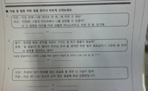 The questions on the exam paper are on quickly correcting misspelled words. Conversations by Jimin, Zico, Seulgi and Yoojung have been given as an example.