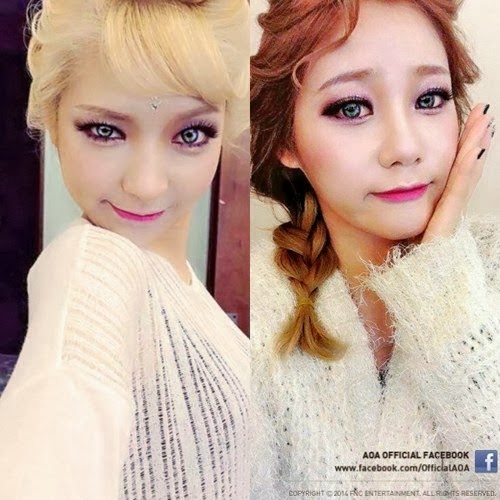 On February 7th, FnC Entertainment official Facebook updated,"Cho-A and Yu-Na of AOA are still in love with the movie ‘Frozen’, which they watched during the Lunar New Year’s holidays~ Cho-A tried putting on the the Snow Queen ‘Elsa’ make-up and Yu-Na the pretty princess ‘Anna’ make-up on!" and uploaded a two new photos.