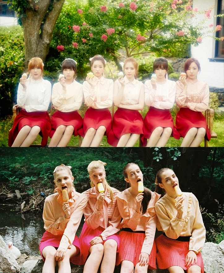 Some netizens on Korean portals are pointing out the similarities and comparing photos they found. The girls in both photos are wearing similar outfits and are even wearing ribbons. However, instead of popsicles, APink are holding cupcakes.