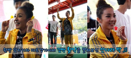 Various games were on the second floor booth, where people could experience different athletic games, and 2NE1 was first challenged to do the discus throwing game. Sandara Park was the first to step up to the challenge, and when she achieved a “world record” on her first attempt at the discus throwing game, she surprised the booth staff, the press, and the audience; charismatic leader, CL, also tried out the challenge.