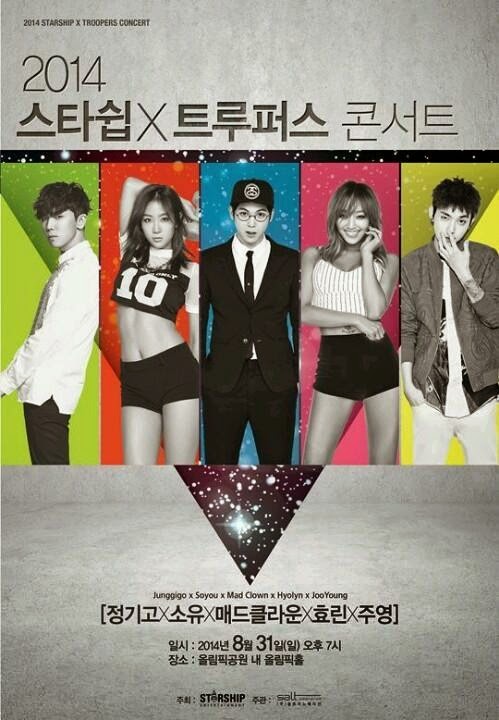SISTAR's Soyou and Hyorin will be representing Starship Entertainment while Junggigo, Mad Clown, and the new artist Jooyoung will be from Starship X. The joint concert is entitled '2014 STARSHIP X TROOPERS' and it will be on August 31st at the Seoul Olympic Hall.