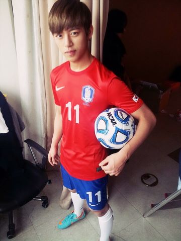 On March 12th, maknae Zelo uploaded a photo on his Twitter and wrote, “B.A.P supports Korea’s women’s national football team!” The photo showed the members wearing their soccer uniforms and posing next to the mascots.