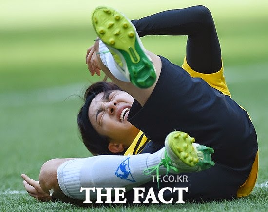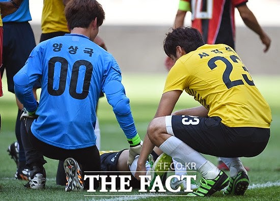 During the game, KiKwang got hit by the ball on his right ankle causing him to fell on the ground in pain. He is immediately rushed to a stretcher and into the ambulance for first aid treatment and headed to hospital. His agency hasn't informed yet about how severe his injury at the moment but let's be hopeful that it's not serious.
