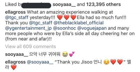 BLACKPINK Jisoo is Mesmerized by Ella Gross's Cuteness!! ELLA GROSSTTSep 05, 2018 Share 0 comments Ella Gross recently uploaded a photo of her catwalk stage in Japan on her Instagram. BLACKPINK Jisoo left a message: "Yah, too cute," Ella Gross replied: "Thank you Jisoo Unnie."Jisoo is very cute too!! Tags: Ella gross, Jisoo, Kpop, Yg entertainment Share Previous articleNext article Leave a comment Name Email Content Post comment