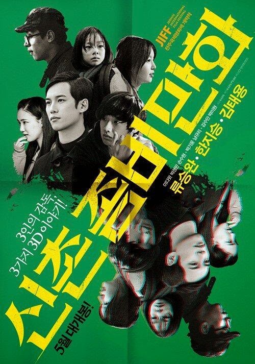 The poster is themed in retro concept with teal & yellow color. The characters are in dramatic black and white effect. The film is going to have three parts directed by Han Ji-seung, Ryu Seung-wan, and Kim Tae-yong.