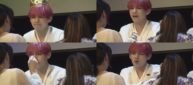 However, V seems to have noticed the fan's cut-out sleeves and tells her that it's a bit 'racy' or revealing and advices her to cover up next time and even makes a pinky promise with the fan.