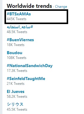 #BTSxAMAs Trends 1st Place On Twitter! BTSDKPOPNEWS OfficialNov 03, 2017 Share 0 comments More than 400K fans are tweeting their excitement after the announcement of BTS' performance at the American Music Awards, join the craze and tweet about the big news! Tags: Bts, Kpop, News Share Previous articleNext article Leave a comment Name Email Content Post comment