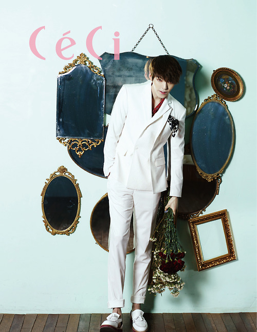Kim Woo Bin had a photo shoot that will really make girls go crazy. On his CeCi video clip, he wore a long red and white suit and pants with a hairstyle that was done nicely. He showed how to be fashionable in eating fruits, going down the stairs, sitting, winking and even standing on a chair.