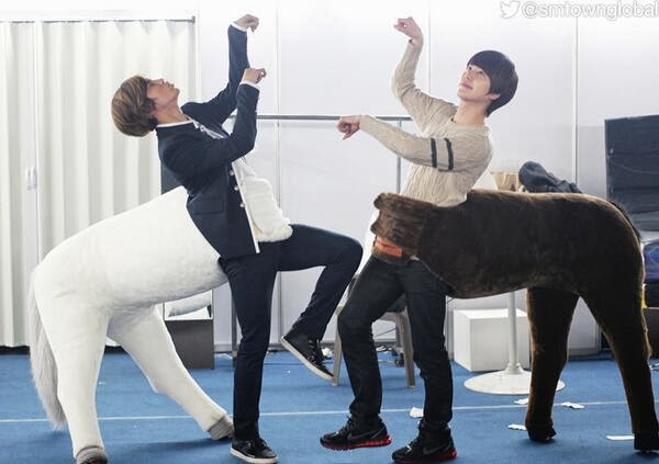 A hilarious photo of Changmin and Kyuhyun wearing horse costume has been uploaded through SMTOWN GLOBAL's twitter account with a caption,