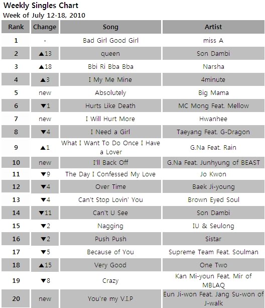 Meanwhile, Son Dambi's latest single "queen" made an incredible 13-spot jump to position itself in second place and climbing up 18-slots to No. 3 was "Bbi Ri Bba Bba" by Brown Eyed Girl member Narsha.