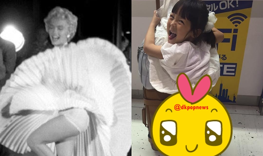 In the photo, Sarang makes her own interpretation of the trademark pose by lifting her dress and hanging it to their luggage while making a mischievous facial expression. The caption is read as "Little Marilyn Monroe️"
