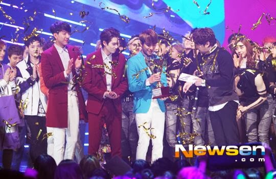 In the photo, the gentlemen are still wearing their performance suits with Yonghwa holding the trophy. Congratulations! Watch their winning moment and performances below: