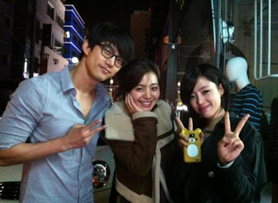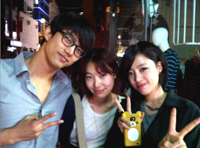 In the picture, Eunjung and Taecyeon of 2pm pose with a V sign and the girl at the middle is seen smiling brightly.