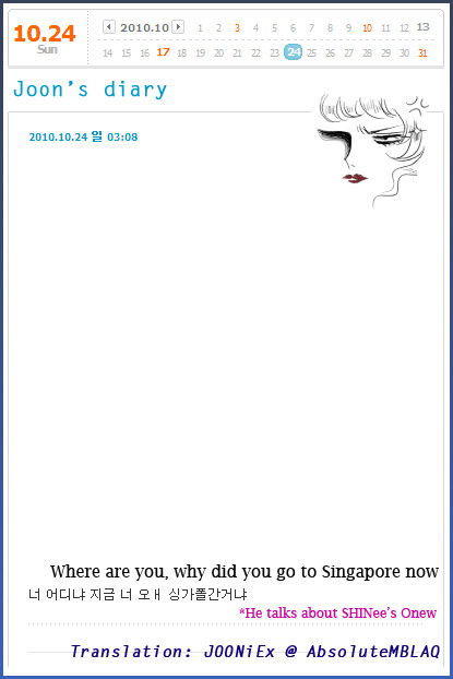 Mblaq won Group artist award yesterday on "Entertainment artist of Republic of Korea". While giving their speech Joon added "Onew-ya! are you watching?". Unfortunately Onew was in Singapore on the same day for KPOP Night Concert. Lee Joon wrote on his cyworld Diary his sadness today October 24th.
