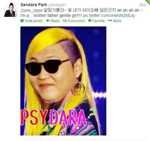 Dara says, "I didn’t realize this~ Why do I look like Psy-oppa? ah ah ah ah ~ I’m a… Mother father gentle girl!!!