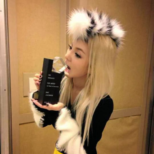 2NE1's dorky member Dara is taking a bite of their Inkigayo trophy as seen on her photo as she captioned, "Ang~~~"