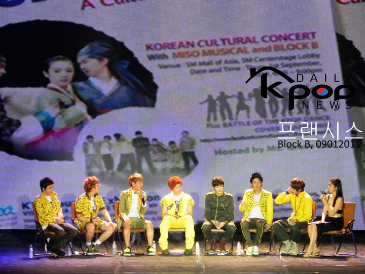 After the performance, they are interviewed and had a question and answer portion. They stated that when they heard Miso Musical will going to perform in the Philippines for "Visit Korea", they volunteered themselves to perform in the country and thanked everyone for huge support even though they haven't started promoting outside Korea yet. Kyung said he can talked English but said "Mahal Kita (I love you)"instead that uproars the scream of fans. When asked who they think is the most handsome, Kyung pointed himself and said he don't have to explain himself and brought laughter. In terms of vocals they all pointed to B Bomb who stood up to dance and project a cool pose. Zico also said that he looked like a vegetable but handsome. They talked about the youngest member P.O. Taeil revealed that although P.O. has a deep voice but is the most cute, cuddly,sweet and kind among the members. U-Kwon shared his "unique" talent, he said he can imitate sounds of animals and gave lots of examples. He imitated the sounds of dog, cat, bird, pig and even a monkey.