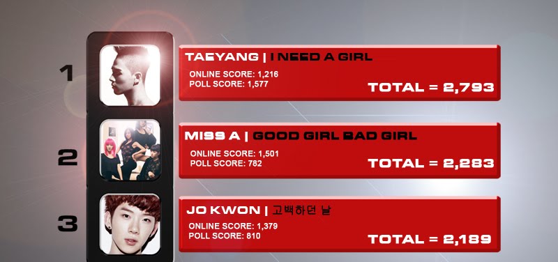 And here is the full result and rankings for this week's 'DKP Weekly Music Chart'. It was a close battle between miss A and Taeyang. miss A has earned the highest for online score and Taeyang has received the highest vote yesterday. After we have combined both online and voting scores, Taeyang edged out other strong contenders with ease and eventually won the chart with 'I Need A Girl' ! Congrats to Taeyang !^^