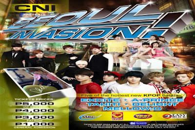 Seoul Invasion is originally scheduled to be on February 9th but due to some problems, it is moved to March 22nd and for one more time, it is moved again to March 31th, 2013. The concert will take place at Philippines ALIW Theater.