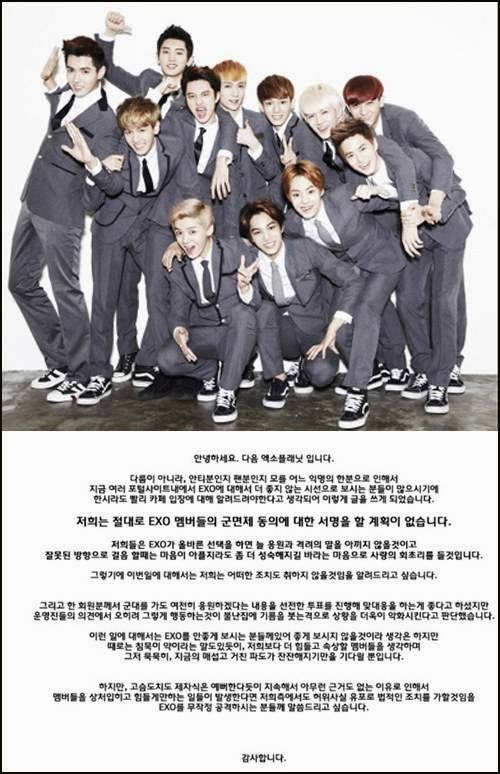 We are writing this statement because of an anti-fan or a fan, because of that person, EXO is being cast in bad light on various portals. We have absolutely no plans to sign any petition to exempt EXO members from military service. We will always support and encourage EXO when they make the right choices, and will discipline them when they go in the wrong direction in order for them to become more mature, although we’ll be hurt. We would like everyone to know that if someone keeps spreading false information to hurt or make things difficult for the members, then we will take legal action.EXO fans allegedly posted on social media that they will be collecting signatures on the group’s fan site as a protest of the two-year mandatory service. The petition has become highly controversial, and despite not having anything to do with it, the EXO members are suffering much hurt.