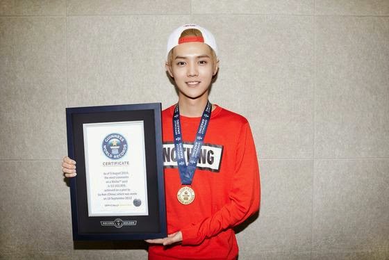 In the photo, Luhan is proudly holding his certificate and is wearing a Guinness World Record medal as well. Congratulations for the record!
