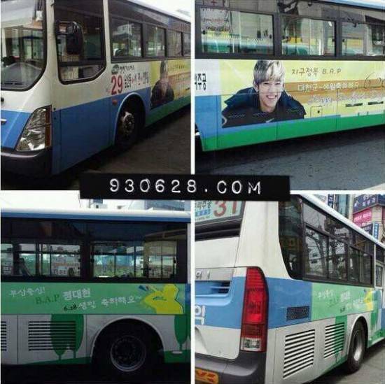 The fans joined forces to fund the advertisements throughout subway station and buses in both Seoul and Busan, Daehyun’s hometown. Especially, a bus advertisement in Busan caught the eyes of the public as it shows the message, “Happy Birthday B.A.P’s Jung Daehyun from Busan”.
