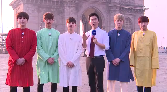 'Fluttering India' cast Kyuhyun, Minho, Jonghyun, Suho, and Sunggyu report about Kpop Wave in India for KBS Morning News Time.