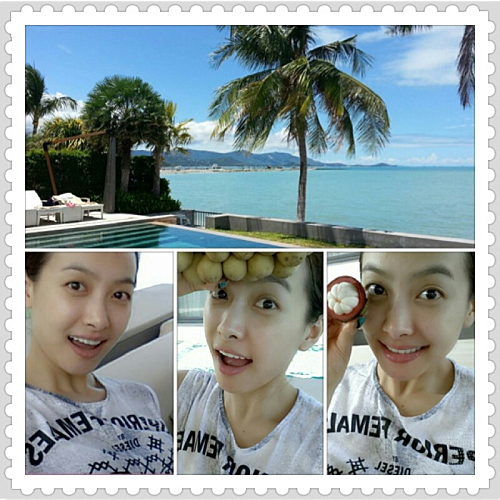 She is seen posing with some tropical fruits in the photos,fans praised her beauty and mentioned that she still looks pretty without much make-up.
