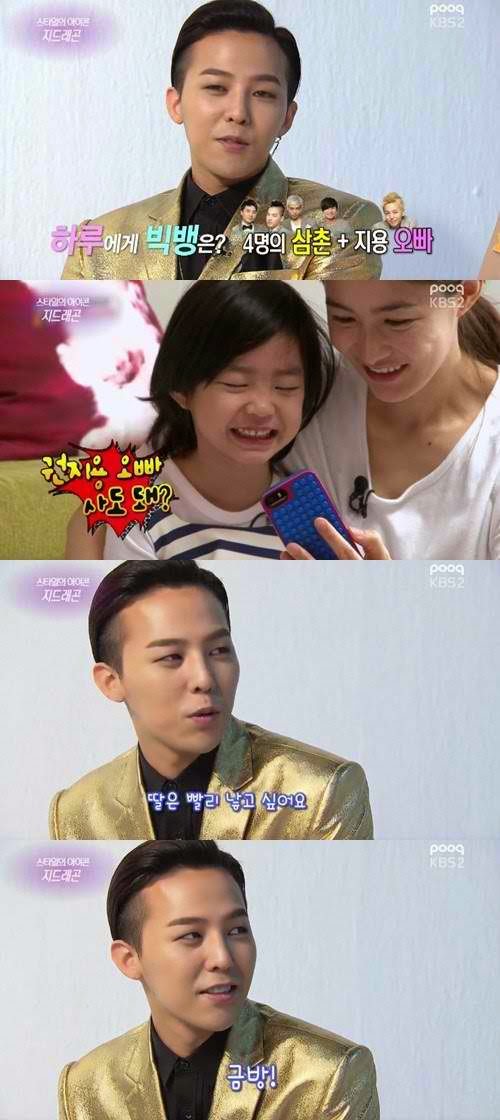 G-Dragon is a very transparent fan of Tablos' daughter Haru. He said, "Haru is very pretty. She calls four of Big Bang members as 'uncle' but she calls me 'oppa' and I really like it."