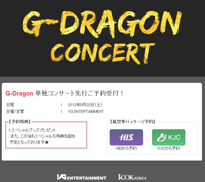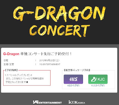 Japanese event hoster LOOK KOREA (also known for hosting travel events to Big Bang's yearly concert "Big Show")has posted online and begun advertising for trips to G-Dragon's solo concert in Korea. They have posted that the event is to be held on September 22nd, and the trip, which includes airfare, hotel room and ticket to the concert is approximately 100,000 yen. This is leading many to believe that this is indeed when G-Dragon will host his concert, since both YG Entertainment and LOOK KOREA have worked together in the past before.