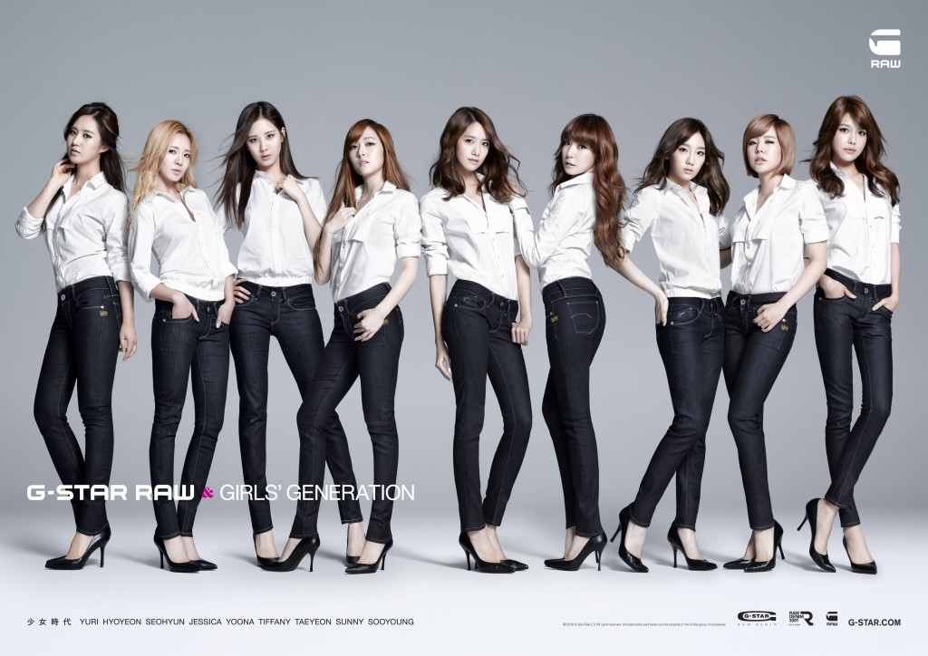 G-Star RAW, a designer clothing company based in the Netherlands specializing in denim, has revealed that Girls’ Generation, Asia’s representative artist, will be endorsing the high quality urban clothing brand in Japan. G-Star RAW Japan released the above image through their Facebook andTwitter accounts as a preview for Girls’ Generation’s endorsement, showing the members in jeans and white tops.
