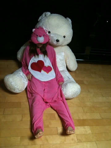 She is wearing a bear outfit here as you can see,it is rare to see her putting up some cute stuffs,maybe she was in good mood when the photo was taken.