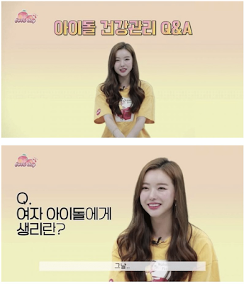 A) You can't do anything about it because it's a natural thing. Honestly, it's hard to do something about it. Wearing pads is uncomfortable. Many idols use tampons because they feel clean. But we do a lot of variety shows, reality shows where you go on overnight trips, and playing games at water parks on Dream Team. Then we take birth control pills. We don't have a choice because they film for a long time. You can't go to the bathroom in the middle of the shoot because the staff will be confused. So if we have those shoots, we control it.