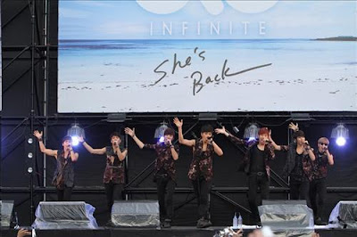 Even though the weather was bad, Infinite showed their splendid performance in the middle of more than 10,000 fans who cheered for them, they started with their new song ‘She’s Back’, their Korean debut song ‘Come Back Again”s Japanese version ‘TO-RA-WA’ and their Japanese debut song ‘BTD’, then sang a song from their Korean album ‘That Year’s Summer’, etc.; They performed 6 songs.