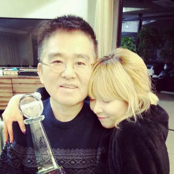 HyunA hugs Daddy Hong with Trouble Maker' MuBank trophy