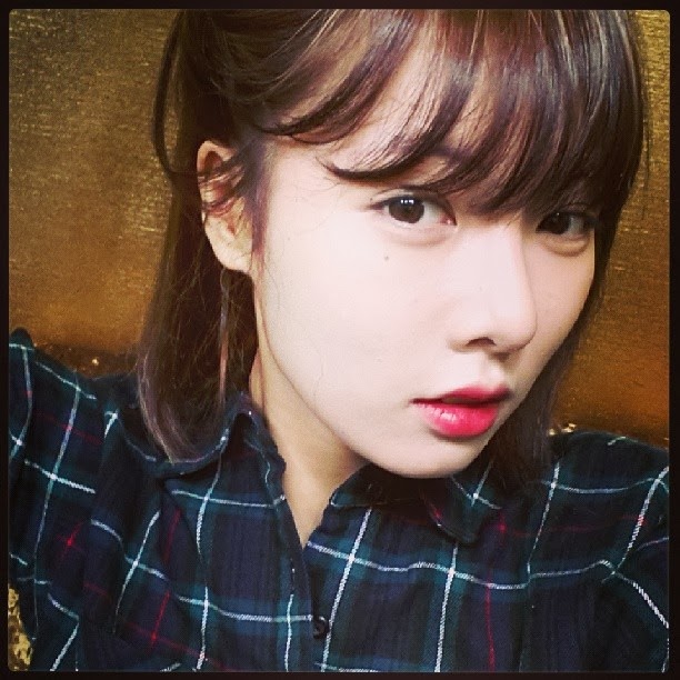 Wearing a simple checkered blouse, Hyuna appeared innocent and younger with her refreshing look. Fans commented, "Black really makes you younger.","I can't see the sexy Hyuna here, you look innocent.","This suits you more.","I like this hair color better." and so on.