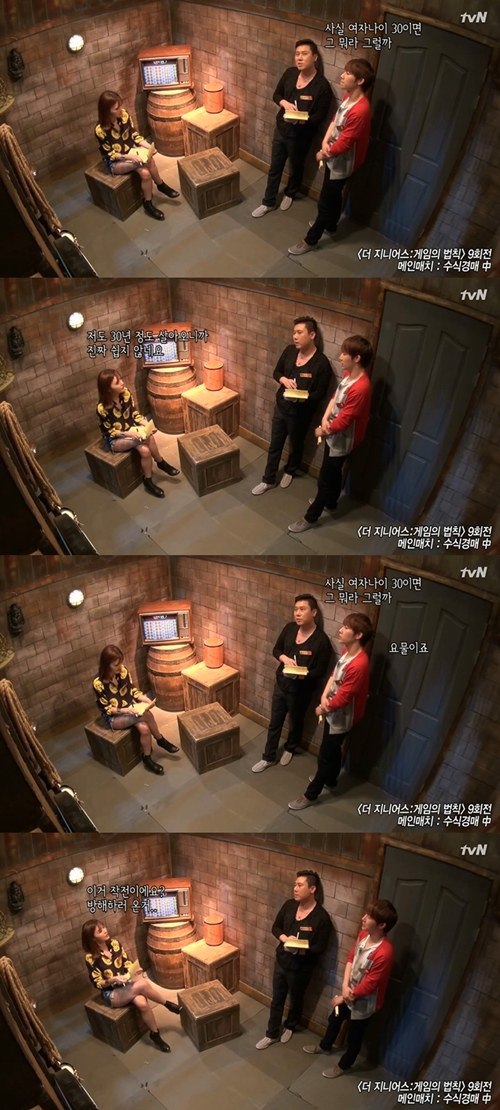In the clip, Park Eun Ji, Lee Sang Min, and Infinite's Sunggyu are discussing about the game. Park EunJi made a comment and told Lee Sang Min, "It's hard to make a living isn't? Living for 30 years, I realized that it's not that easy." in which Sang Min replied, "Yes, it's true.. for woman as they reach 30..." In this part, Sunggyu interrupted and finished with his remark "she became yomul**."