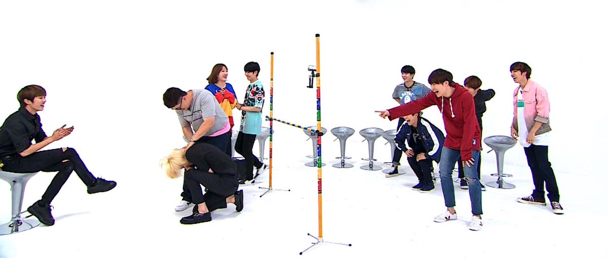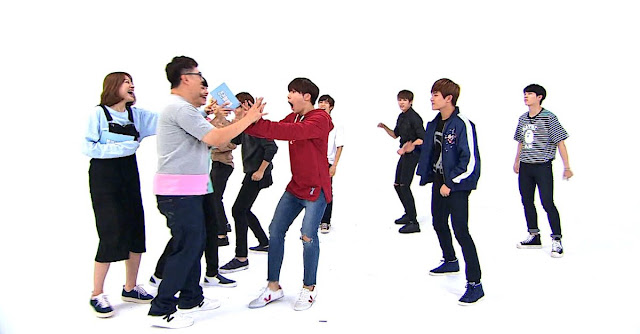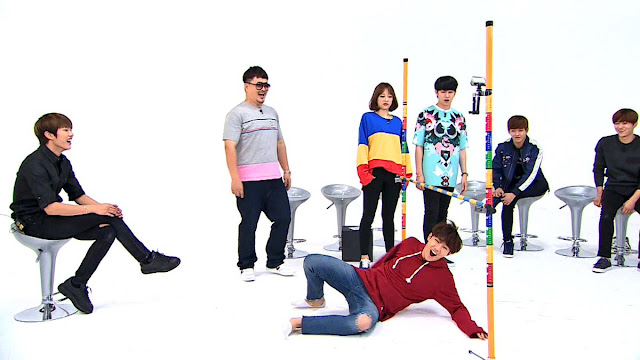 "Weekly Idol" releases preview photos from their recording and the episode is already looking hilarious with the boys doing funny poses and aegyo, laughing out loud with the hosts, playing limbo, and more.