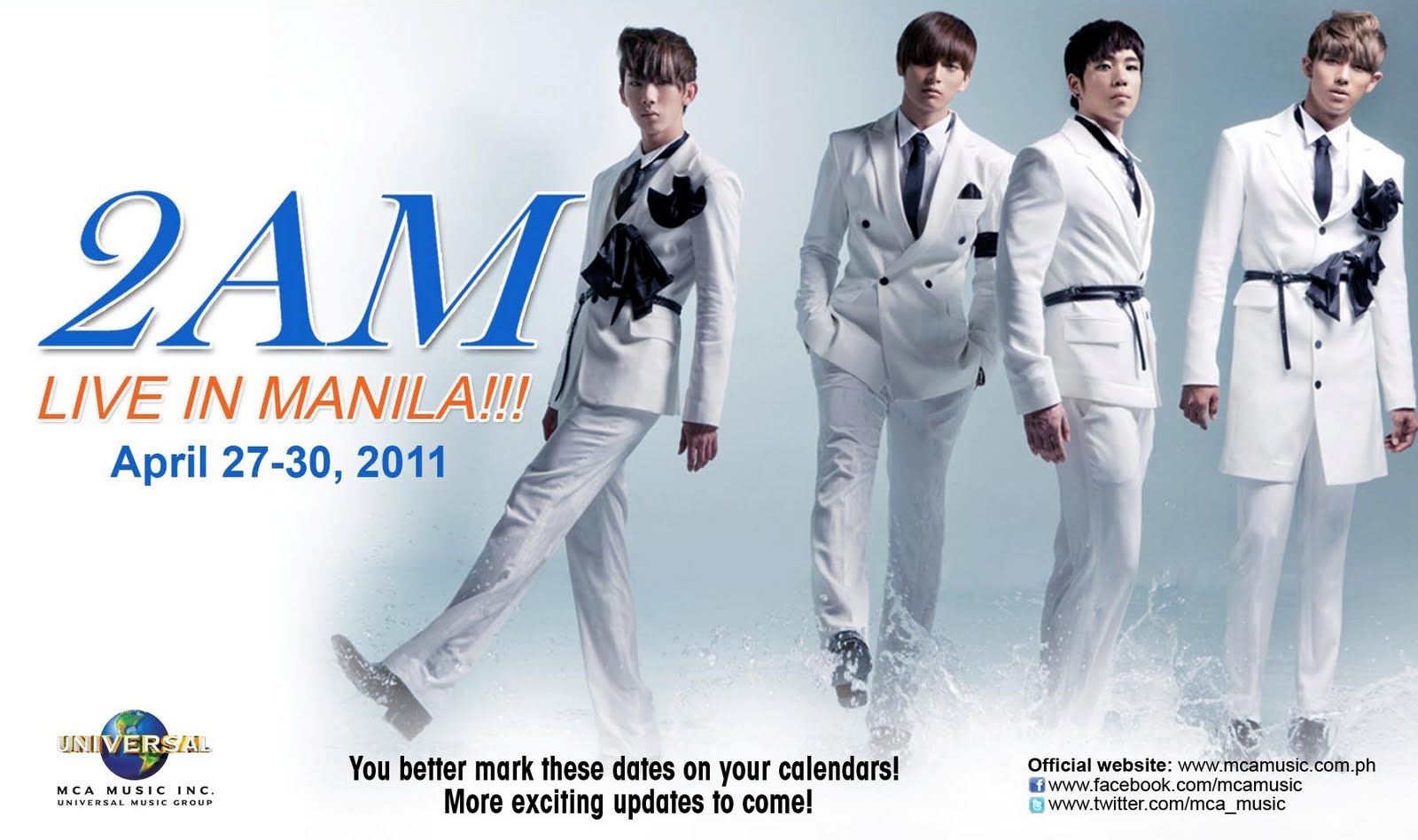 2010 has been 2AM’s year as they have won numerous awards in Korea, among which includes the Digital Music Bonsang award at the 25th Golden Disk Awards, T-World Best Songat the 2nd Melon Music Awards and Best Vocal Performance by a Group at the Mnet Asian Music Awards. This year, 2AM won the Bonsang and R&B Ballad Award at the 20th Seoul Music Awards. With the group’s overwhelming accolades and rising popularity worldwide, this Manila promo tour