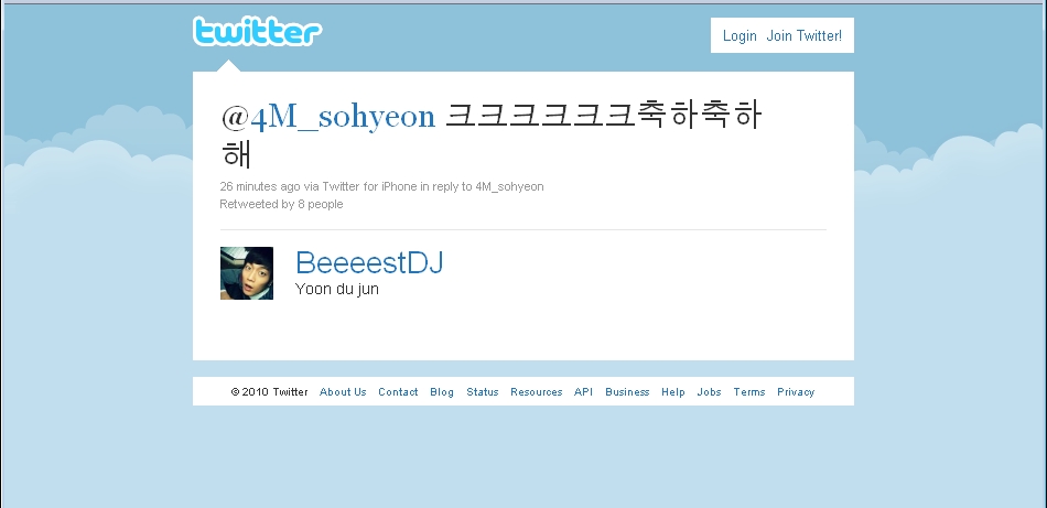 4Minute Maknae, Kwon Sohyun just joined twitter world, it's confirmed by Beast Leader, Yoon Doojoon. he tweeted,"크크크크크크축하축하해" which is mean, "Kekeke Congrats, Congratulations" to Sohyun not a long ago.