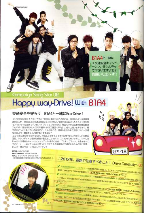 with B1A4, everyone will follow it right? Please~! Campaign Song Star 02Happy was-Drive! With B1A4Let’s protect traffic safety Eco Drive with B1A4!Are you familiar with <29:300>? It is a word that has been created to state the very narrow strange signs of there being that before 1 big accident occurs, there are approximately 29 minor collisions and over 300 traffic law violations. (by Heinrich) The amount of car accidents in Korea in a year is 226,878, and deaths from those accidents are 5,505 (2010 standard) and this exceeds over twice the average level of the OECD, and is in a situation avoiding the very last. At times like this are when we need to pay more attention to the ‘Traffic Safety’ that is easy to miss throughout our everyday lives correct?29:300>Here we will teach you what ‘Traffic Safety’ is, taking initiative and using their bodies, pay attention to B1A4’s practice of the traffic safety with their promising actions. Heavily armed with their trendy sense of music, they came back with their first albumand are now the 2nd runner-up for the ! “Please Stop! Please protect the safety!” Laughing while protecting the traffic safety, let’s Eco with B1A4 together today as well for the traffic safety of the advancing country of Korea!