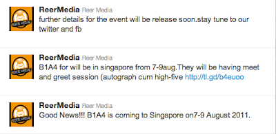 Reer Media has tweeted about an hour ago with some great news to Singaporean fans! They said that B1A4 will be in Singapore from 7-9th August 2011 to hold a meet & greet event as well as a showcase in Singapore.