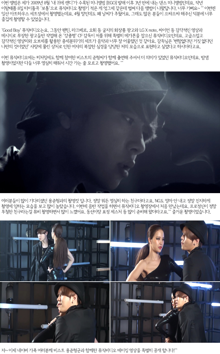 The music video for 'Good Boy' the CF producer for Pantene, LacVert, Ohui, LG X Note, Cyon, etc making videos with sense and messages Kim Jong Myung Producer was the one who grabbed the megaphone and helped record the music video. Using advanced objects with sense in the midevil scenery it went very well with the music. The producer said he wanted to express the thought that a girl had when she was hurt by love like 'With no change and no lies it was mine'.