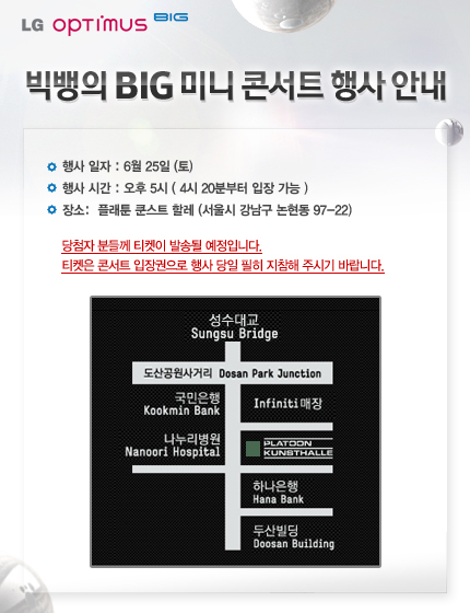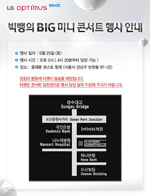 [Info] BIGBANG LG Optimus BIG Mini Concert in Seoul on June 25 Big Bangshayne kayJun 20, 2011 Share 0 comments Details - Concert : LG Optimus Big Mini Concert- Date/Time : Sat, June 25, 17:00 onwards- Venue : Platoon Kunsthalle Seoul | Map – Ticket : Join LG Optimus Big’s event” Source: LG Optimus BIGCredits: TeamBB Tags: Big bang, Info Share Previous articleNext article Leave a comment Name Email Content Post comment