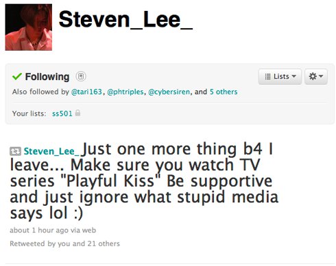 [info] Composer Steven Lee,''Watch TV series 'Playful Kiss' '' InfogellieAug 26, 2010 Share 0 comments Very supportive friend of SS501, Steven Lee tweeted yesterday.Source: twitter.com/StevenLee_Credit: ss501fighting.wordpress.com Tags: Info, Jung so min, Kim hyun joong, Playful kiss, Ss501, Steven lee Share Previous articleNext article Leave a comment Name Email Content Post comment