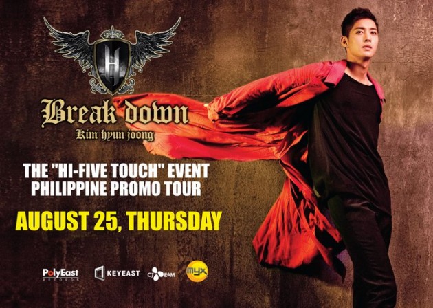 PolyEast Records the organizer of the said event, confirmed it from their facebook page tha they will bring the famous "Boys Over Flower" boy in Manila. Kim Hyun Joong will invade Manila to promote his "Break Down" album and for the "HIGH-FIVE" touch event.