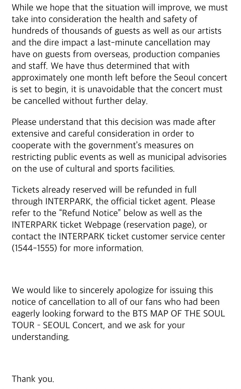 [Info] MAP OF THE SOUL TOUR – Seoul Concerts have been cancelled [200228] BighitEntbtsdiaryFeb 28, 2020 Share 0 comments Credits : Weverse Tags: Bighitent, Bts, Bts map of the soul tour, Info, Seoul, Weverse Share Previous articleNext article Leave a comment Name Email Content Post comment
