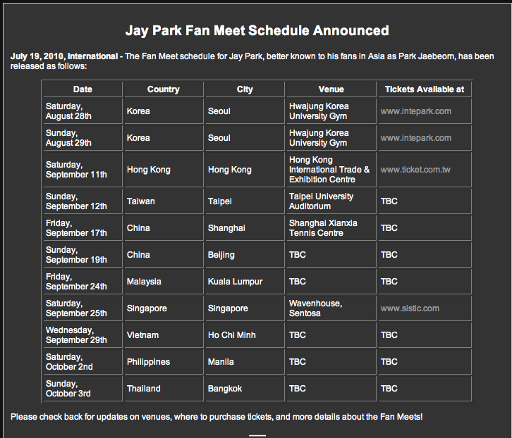 The idea of the fan meets has been in development since May when several top promoters approached Jay’s management about the possibility of doing fan meets for Jay in their own countries. There are discussions about expanding the tour to additional cities in Asia and North America.